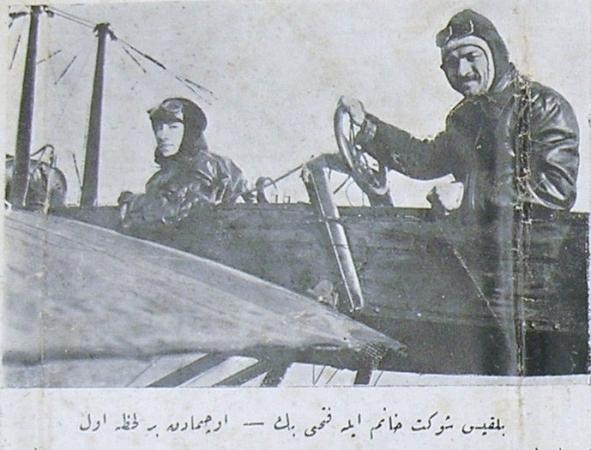 صورة االطيارة العثمانية بلقيس شوكت و هي راكبة في الطائرة مع الطيار فتحي بك قبل لحظة الاقلاع