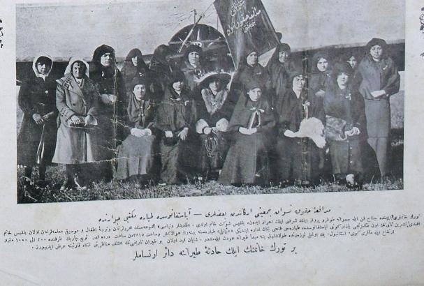 فوصل أعضاء “الجمعية النسائية للدفاع عن حقوق المرأة العثمانية” يوم الاثنين بواسطة العربات إلى استافانوس حيث “مكتب الطيّارة”. وبعد استراحة قصيرة توجهنا إلى الطائرة التي قُدمت هدية إلى جيشنا المظفر من قبل حضرة السلطان المعظّم.
